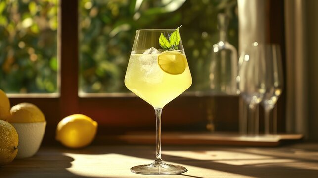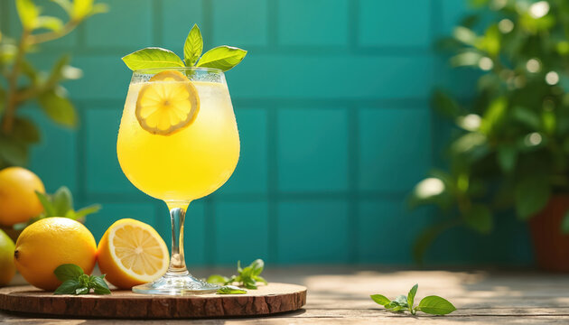 Bright yellow limoncello spritz cocktail with lemon slice and mint garnish sits on wooden surface. Fresh lemons and mint sprigs nearby. Outdoor setting with sunshine and green plants.