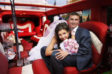 Happy bride and groom about limousine in wedding day. Copy space image. Place for adding text