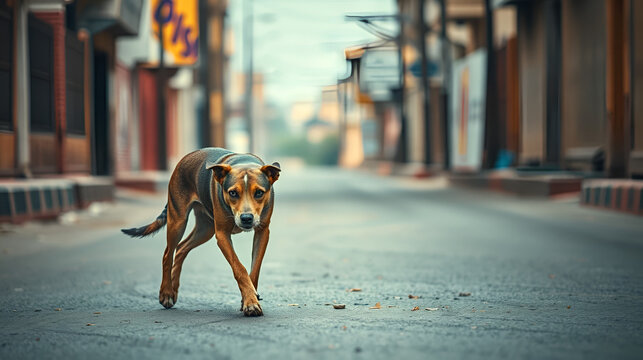 An injured stray dog limping through empty streets, its eyes telling a tale of survival against the odds