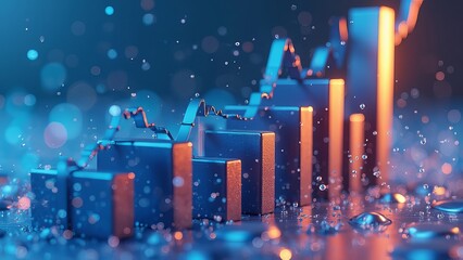 Futuristic financial analytics 3D bar and line charts on dark abstract business technology background
