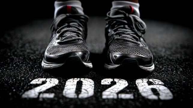 Runners prepare to take off from the starting line marked with 2026, symbolizing an exciting new year filled with athletic challenges and triumphs ahead