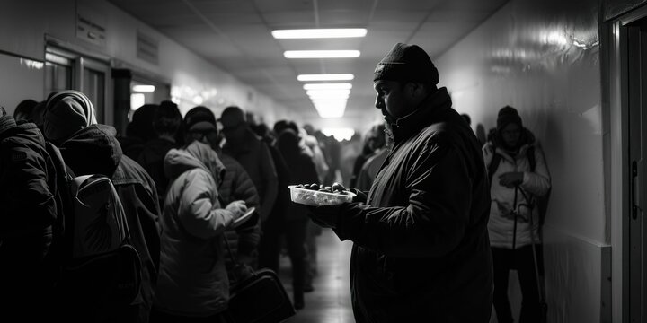 Long line of students with backpacks waiting in a school cafeteria, viewed from behind in a bright hallway, capturing the busy lunch rush and campus atmosphere.