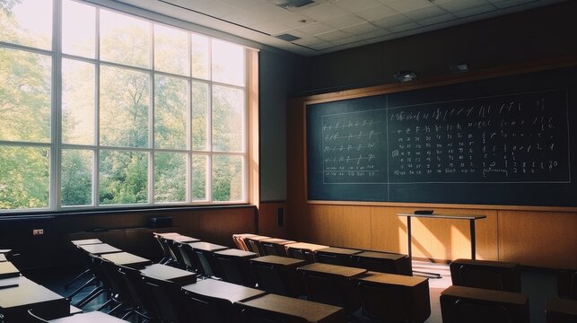 An empty classroom with a chalkboard full of equations, bathed in soft natural light from large windows.