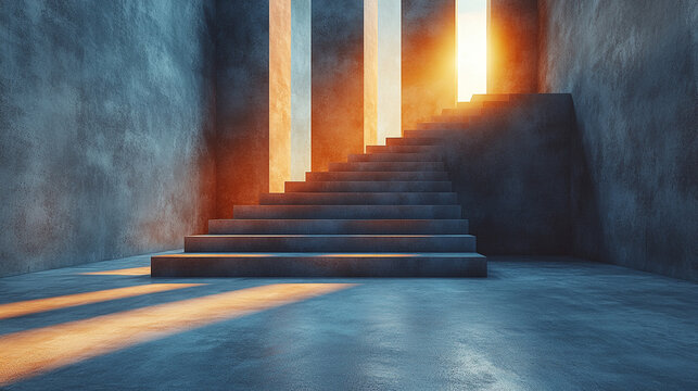 A wide gray concrete interior with a central podium and sleek linear lamps on the wall exudes minimalism and modern elegance bright light tones create depth with blurred empty caption space on the sid