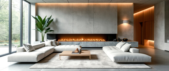 Modern Minimalist Living Room with Linear Fireplace on Concrete Wall