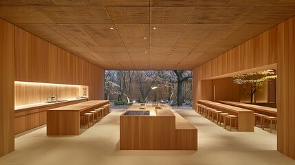 A modern kitchen interior featuring natural wooden walls and furniture