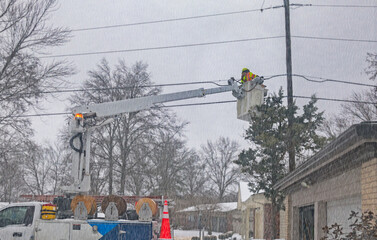Technician lineman in bucket truck repairing overhead lines during snow storm