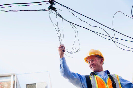 Electrician workman in green safety vest and helmet in crane lift working on highlines or traffic lights high in the air with sky background