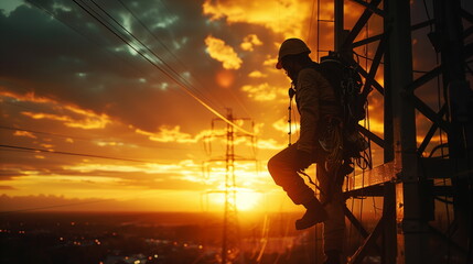 Silhouette of Electrician repairing wire on electric power pole at the sunsetbackground.