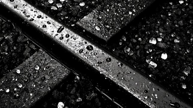 Closeup view of wet railway track with raindrops highlighting the rail and gravel texture in monochrome setting