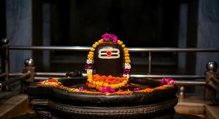 Pradosh Vrat: Shiva linga decorated with bilva leaves, flowers, and diya lamps, shot during Pradosham evening puja, sacred ambiance, clean background