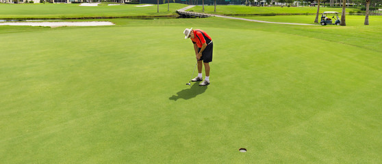 Senior golfer planning his putt on a golf green