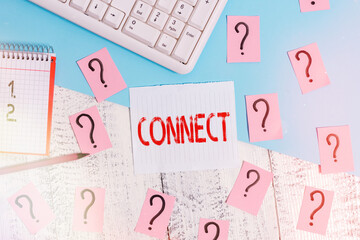 Word writing text Connect. Business photo showcasing to join or fasten together usually by something intervening Writing tools, computer stuff and math book sheet on top of wooden table