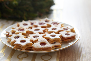 Traditonal Linzer Christmas cookies filled with strawberry marmalade
