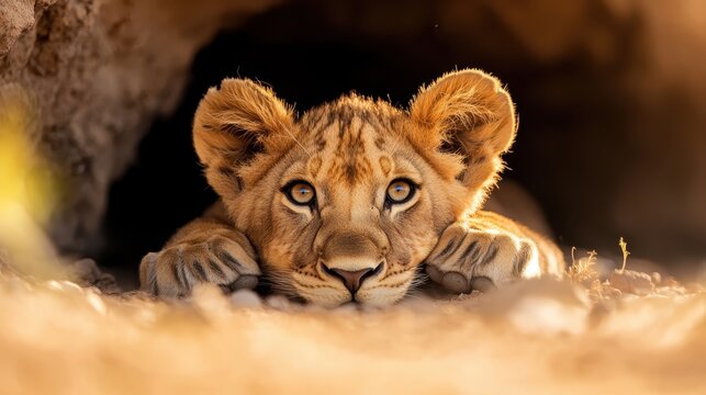 A charming lion cub rests comfortably at the entrance of a cave, with its bright eyes exhibiting curiosity and playfulness, symbolizing innocence and potential.