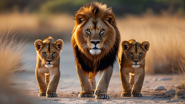 A lion and two cubs walking towards the camera in a dry grassy field at golden hour lighting