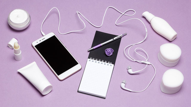 Makeup products realistic vector illustration. Cosmetic containers on colorful glass circles background. Advertising mock up, beauty banner template with product categories for online store.