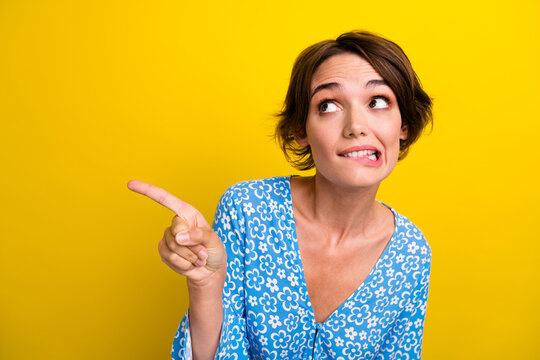 Photo of confused woman with bob hairstyle dressed print blouse indicating look empty space biting lip isolated on yellow color background