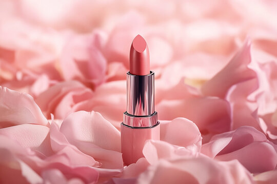 Pink lipstick surrounded with rose petals