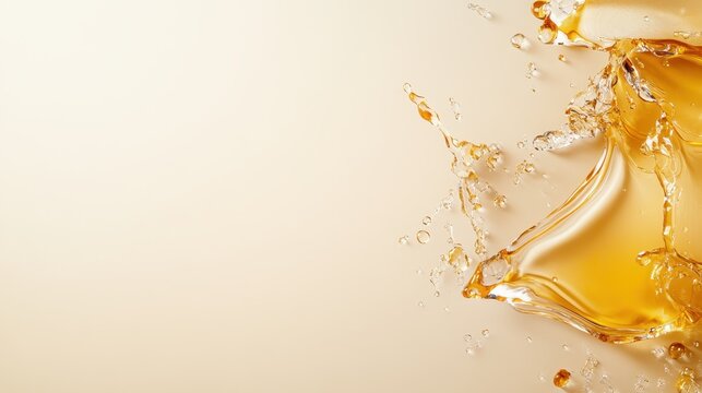 An artful render of liquid gold forming elegant arcs and gentle splashes is beautifully portrayed over a neutral beige canvas background, expressing fluid elegance.