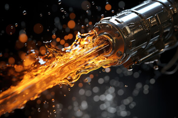 A fuel nozzle suspended mid-air, with liquid fuel droplets forming a dynamic pattern below, symbolizing the energy and fluidity of modern fuel systems. Generative Ai.