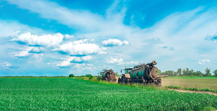 A tractor in an agricultural field spreads manure from a tanker and fertilizes grassy vegetation for cattle feed. Fertilizer and vegetation in agriculture.