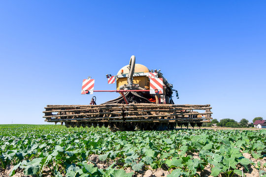 A farm tractor fills its liquid manure from the tank trailer into a manure depot. Manure is used as fertilizer in agriculture. Concept: agriculture
