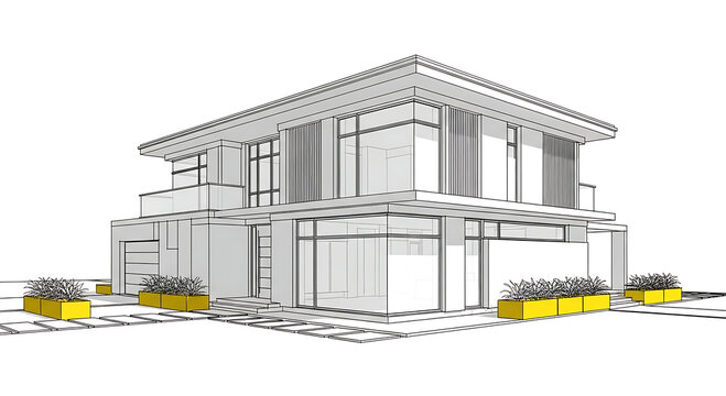 Architectural design sketch of a modern twostory house with large windows and a flat roof, isolated on white background the house is surrounded by greenery