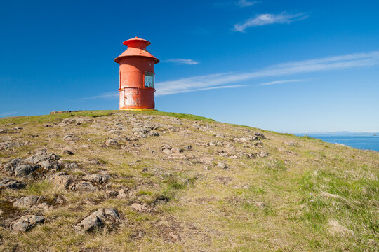 Little red lighthouse in the dunes near Agger Tange, Jutland, Denmark, Europe