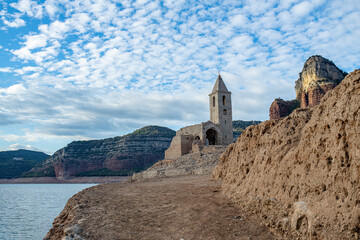 Sau reservoir very dry with little water and bell tower of San roman de Sau in Girona Catalonia Spain