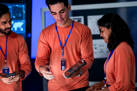 A data analytics team in a command center reviews a live security feed on a mobile device. They are collaborating on a strategy to respond to a new threat on the network.