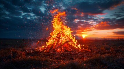 Bonfire crackles under dark twilight sky on field before June, marking time for celebration and customs. Sparks and flames burst into starry night at evening dusk.