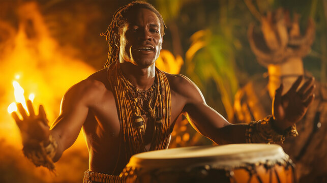 Expert drummer performs passionately under vibrant flames during cultural celebration at night