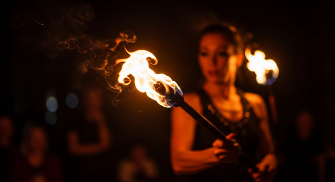 Woman performing fire dance with torches at night during festival