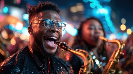 A joyful musician passionately plays the saxophone in a lively parade, surrounded by vibrant colors and an energetic crowd, reflecting the celebration of music and community spirit.