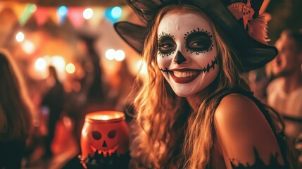 Elaborate Halloween costumes bring joy as adults celebrate together at a lively costume party adorned with decorations and music