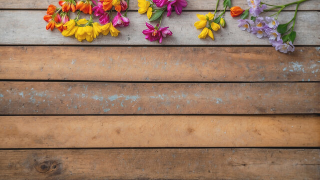 Vibrant, colorful flowers arranged on a wooden table with a pastel tone. Ideal for wallpapers and backgrounds, this image adds a lively and fresh touch to any design.