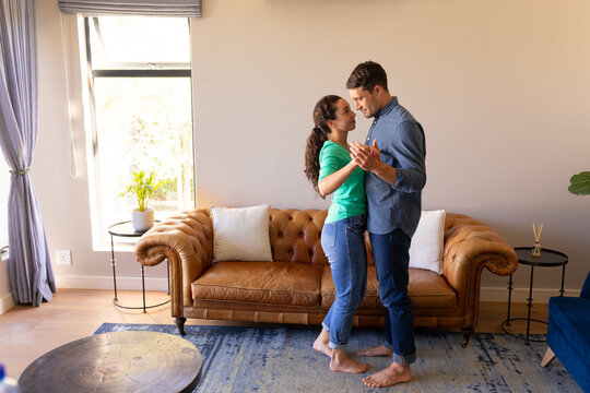 Cheerful multiracial couple sitting on sofa in the living room - Happy family moving in new home - Real estate and stylish furniture concept
