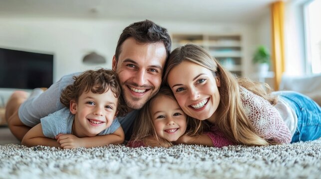 A family of four enjoys time together at home. A woman with brown hair, two boys with curly hair, and a man with curly hair look at a tablet. A white dog sits nearby.