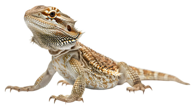 A close-up of a bearded dragon lizard looking upward,cutout on transparent backgrounds.