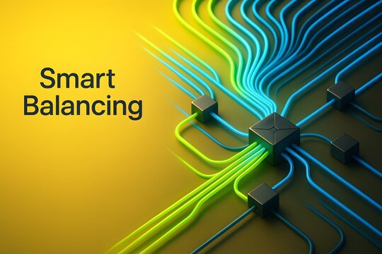 Load balancing concept. A large data stream is intelligently split to flow evenly across multiple holographic servers to prevent overload.