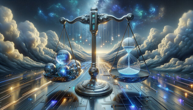 Futuristic balance scale in serene digital dreamscape.