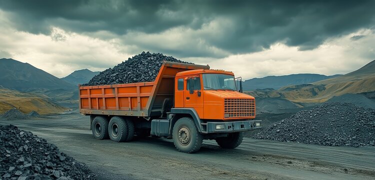 Transporting Coal Using an Orange Dump Truck in a Mountain Quarry Under Dark Clouds