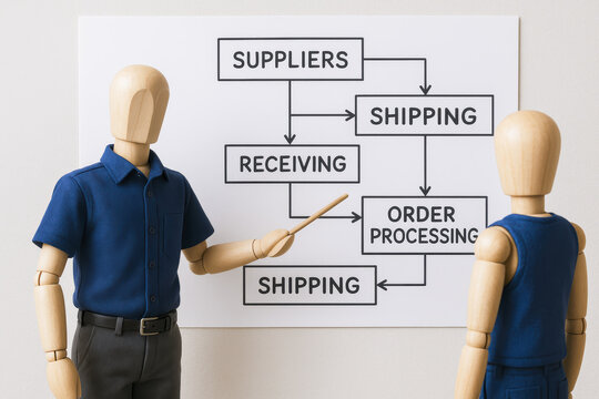 A wooden mannequin explains an efficient workflow involving suppliers receiving order processing and shipping for streamlined logistics