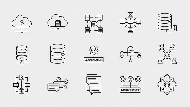Cloud Computing and Network Technology Icons Set - Data Servers, Load Balancer, Microservices
