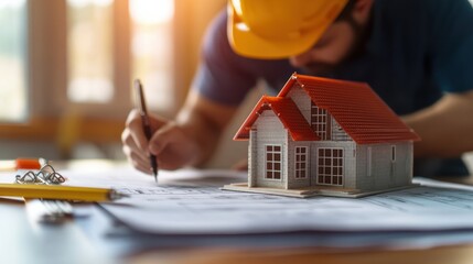 Mortgage loading and property document concept for real estate , small home with architect working with pen in blur background.