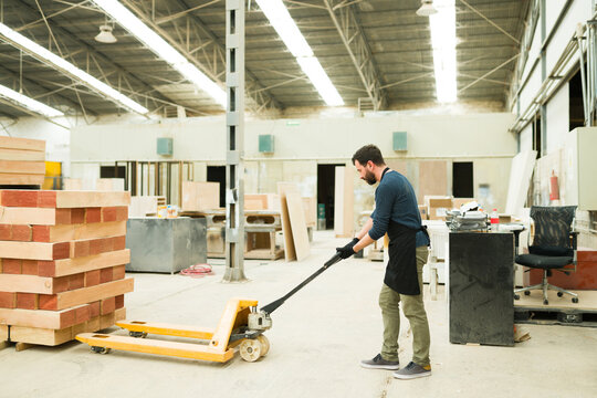 Warehouse worker steadying boxes on pallet jack with social media metrics overlays