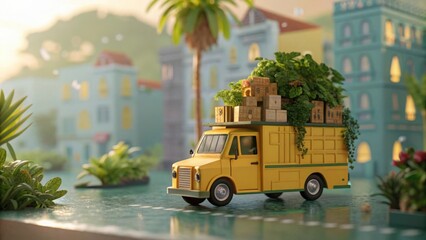 Stylized yellow truck loaded with plants and boxes drives through a miniature town vehicle delivery