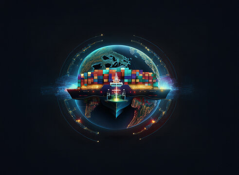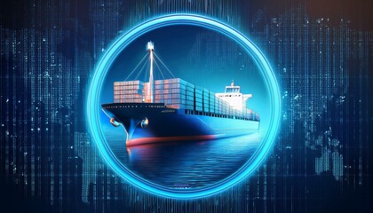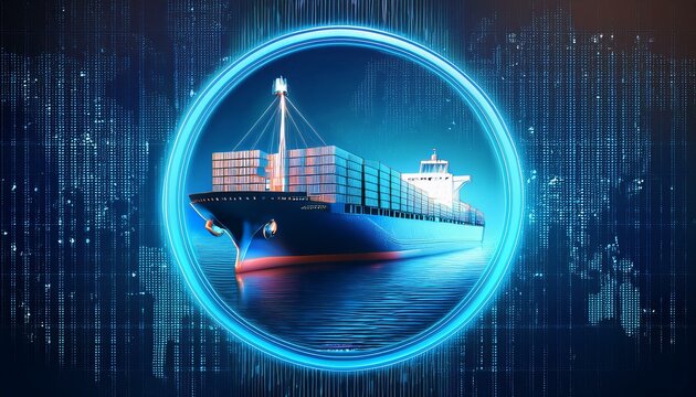 Global Trade: A container ship, a symbol of global trade and connectivity, is depicted in a digital illustration, encircled by a glowing ring against a backdrop of data and technology.