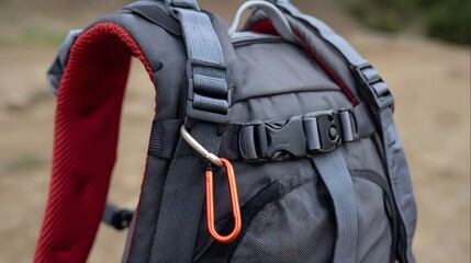 A detailed close up of a grey backpack s adjustable straps buckles and an attached orange carabiner ready for outdoor adventure
